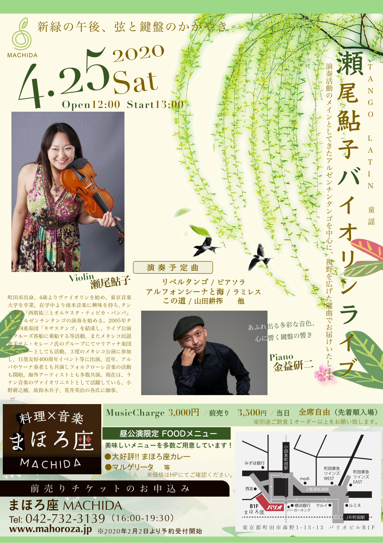 2020.2.9 PICK UP !! 4月公演「瀬尾鮎子バイオリンライブ」、情報アップしました。